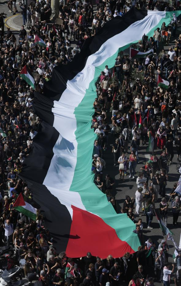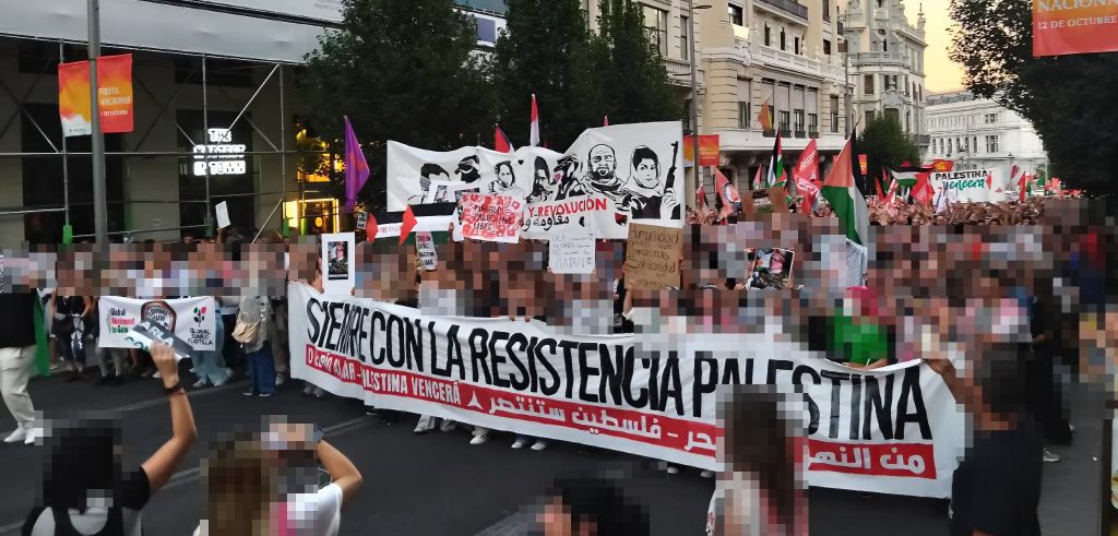Como anteriormente mencionamos, el movimiento propalestino convocó movilizaciones para el sábado 4 de octubre. Finalmente, fueron más de 70 las ciudades en las que hubo manifestaciones. Destacan Madrid y Barcelona, con casi medio millón de manifestantes en cada una, y otras ciudades como València, Iruña, Sevilla o Tenerife. En muchas ciudades, negocios con intereses sionistas como Starbucks o Zara fueron atacados. Que sepamos, hay cerca de 20 represaliados sumando todas las manifestaciones de las más de 70 ciudades. Dejamos algunas imágenes y videos a continuación: