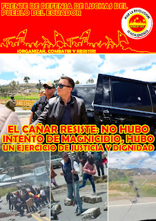 Noboa ha aprovechado ese valiente y oportuno acto de rechazo a su presencia para gritar al mundo que se intentó atentar contra su vida; y, como si no bastara, su escolta militar-policial capturó aleatoriamente a cinco hombres y mujeres de nuestro pueblo que estaban en el lugar. Ahora esas compañeras y compañeros han sido detenidos y recluidos en una cárcel de máxima seguridad y, como si fuese poco, judicializados bajo acusaciones de terrorismo y magnicidio.