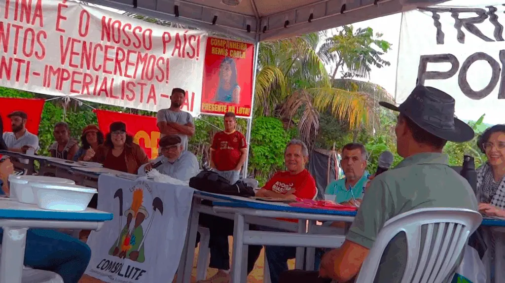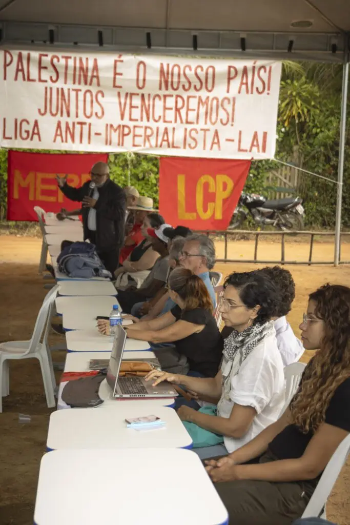 El representante explicó luego la lucha campesina en Brasil es una guerra de baja intensidad con picos como la lucha de Barro Branco contra el latifundio, pero también contra el oportunismo, que intenta engañar a la gente para detener la lucha. “La autodefensa armada debe ser defendida en todas partes”, comparando Barro Branco con Palestina y los dos años de resistencia armada. Destacando así la lucha internacional antiimperialista conjunta como una necesidad.
