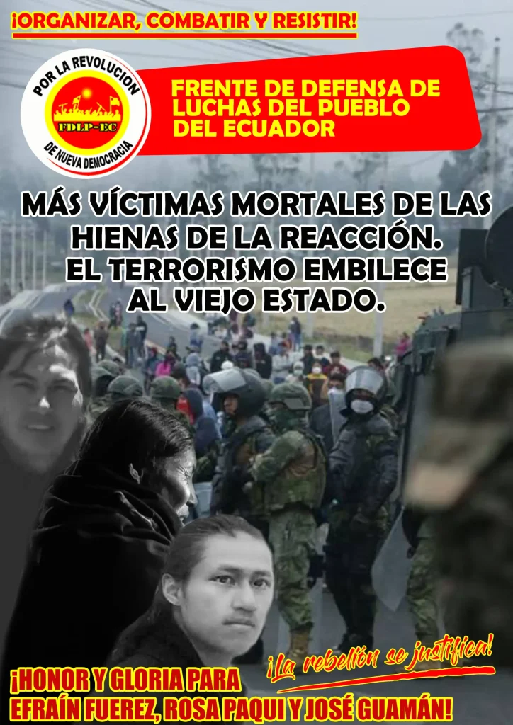 La represión del Estado ecuatoriano contra el pueblo continúa, especialmente contra la rebelión del pueblo en la región de Ibarra. El Frente de Defensa de Luchas del Pueblo del Ecuador ha publicado un pronunciamiento político sobre el martirio de tres compañeros que han caído en la lucha. Lo publicamos a continuación: