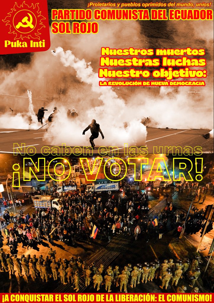 ¿Qué recibió el pueblo con la Constitución de 2008? ¡Nada! Igual nos han explotado, oprimido, agredido y violentado; es más, nos hemos ahogado en sangre y nos hemos visto forzados a migrar o a morir en el intento. Ahora nos quieren imponer otra Constitución. ¿Cambiará con relación a la anterior? Posiblemente en sus formas, pero no corresponde al proletariado, al campesinado pobre y a las demás masas explotadas avalar un instrumento político que legitima al viejo Estado y lo presenta en su versión más “sutil” en el terreno del sistema de gobierno. Pueblo del Ecuador, recuerda: asistir a las urnas, ya sea para elegir autoridades o para una nueva Constitución, solo avala lo actuado por todos los gobiernos, particularmente por este último, sostenido en la violencia imperialista, la mentira y gobernar en función de los intereses de la gran burguesía y de los grandes terratenientes.