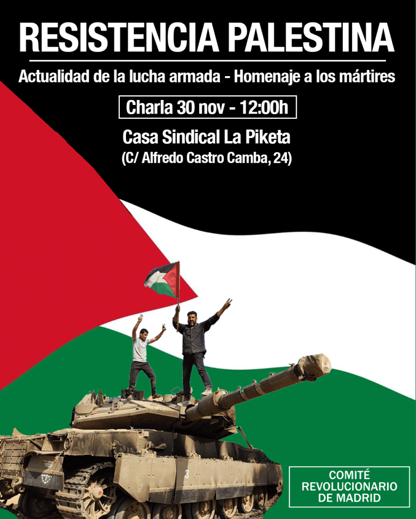 Desde el Comité Revolucionario de Madrid hemos organizado una charla sobre la actualidad de la Resistencia Nacional Palestina y su lucha armada. ¿Qué es la Resistencia Palestina y qué facciones la componen? ¿Por qué la contraofensiva táctica del 7 de octubre de 2023, el Diluvio de Al-Aqsa, fue una victoria? ¿Por qué Israel está perdiendo la guerra y está condenada a perder? ¿Por qué el último alto no tiene nada que ver con los «acuerdos de paz» de Trump? Trataremos de responder a todas estas preguntas.