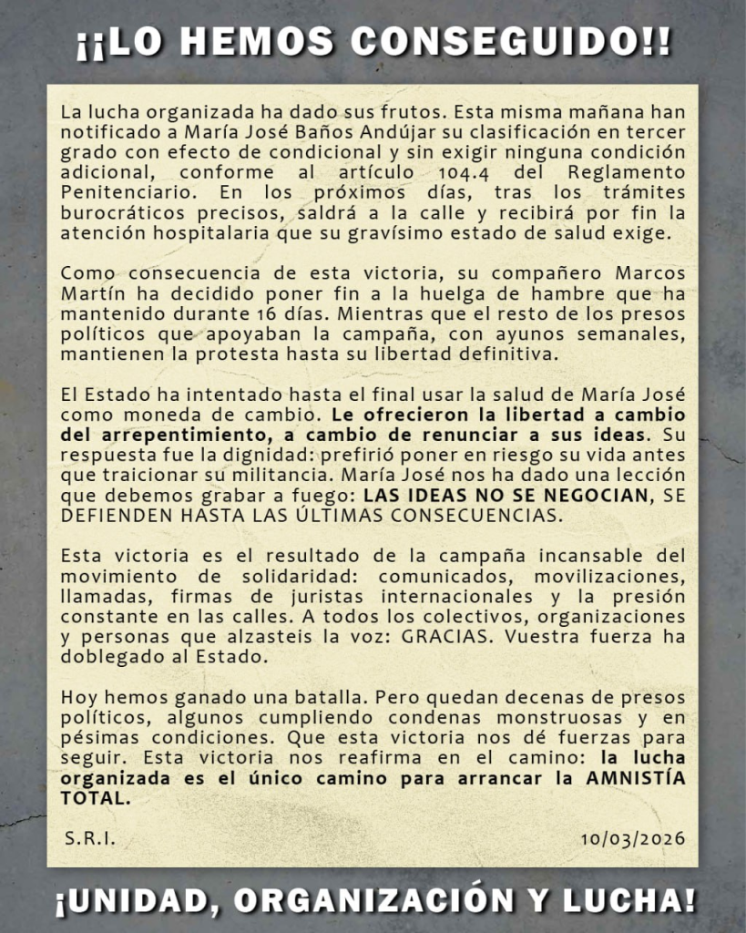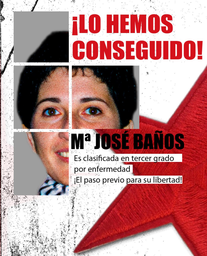 Nos alegra informar que la campaña solidaria por la liberación de María José Baños, presa política de los GRAPO, ha conquistado una importante victoria. El Estado le ha condecido el tercer grado por enfermedad.