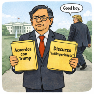 Gustavo Petro tampoco tiene nada de progresista. Petro no está haciendo reformas, sino medidas. Las reformas son conquistas que consigue el pueblo después de derramar su sangre en las calles, donde varios hijos e hijas del pueblo se convierten en mártires. Cuando las reformas no vienen de la lucha, sino de los pasillos y los despachos, son medidas contra el pueblo. Medidas dictadas para reestructurar el capitalismo burocrático, para tratar de salvarlo de su crisis y profundizar la línea burocrática en la administración, en la economía y en la cultura. Todo lo que ha hecho Petro son medias al servicio de los imperialistas y los terratenientes. Petro ha traficado con los intereses de las masas y ha traicionado a los mártires y presos del Gran Levantamiento Popular que sacudió Colombia en 2021. Petro contribuyó a la desmovilización del pueblo, es el bombero apagahuelgas más grande de Colombia. Si no tiene nada de progresista, mucho menos de antiimperialista. Además de permitir las incursiones militares en Colombia bajo “la guerra contra la droga”, continuando la “cooperación militar” (sometimiento) con los yanquis, la historia lo recordará como un personaje ridículo y patético. Después de “enfrentarse” a Trump por los bombardeos a Venezuela, se reunió con él y declaró que la reunión había salido de 9 sobre 10. Trump, por su parte, declaró que Petro era “una persona fantástica”. ¡Menudo antiimperialista, que eres «fantástico» para tu enemigo!